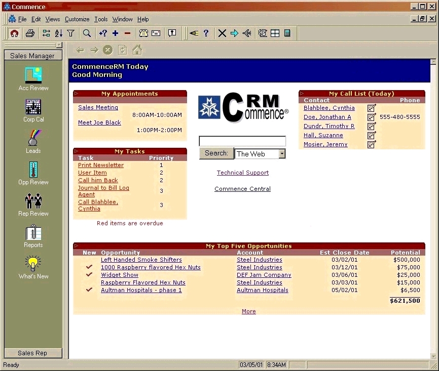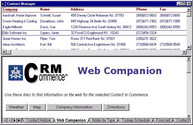 Microsoft Outlook Integration Commence is tightly integrated with Microsoft Outlook to enable logging email into Commence and for synchronization of Contacts, Calendar, and Tasks. Additional integration features support Outlook's group scheduling features and accessing Commence records as an address book when sending email messages. Web Internet/Intranet Integration Commence includes Internet URL (web addresses) & email field types that are used to capture these special information types. These field types enable quickly navigating to a web site or launching a new email message with the proper address. Also, end users can access the Web directly from within their Commence desktop. An example is provided below: