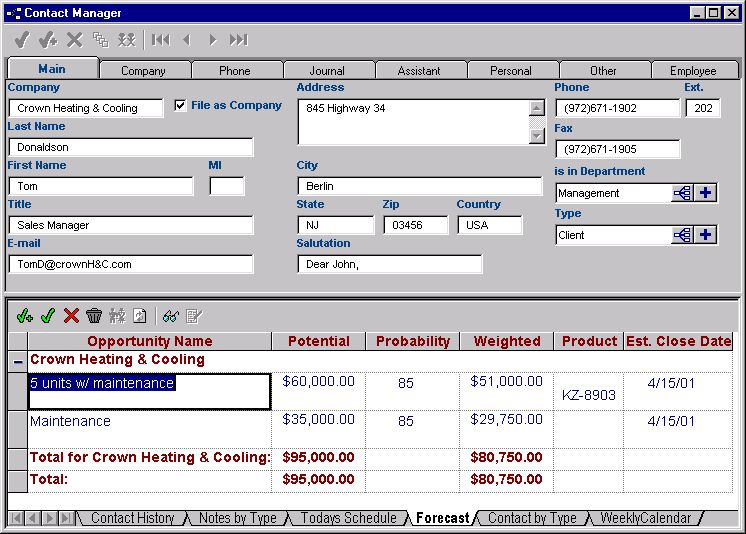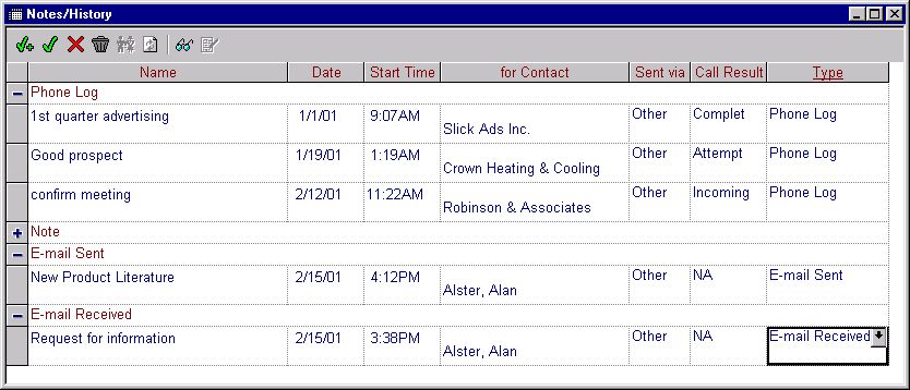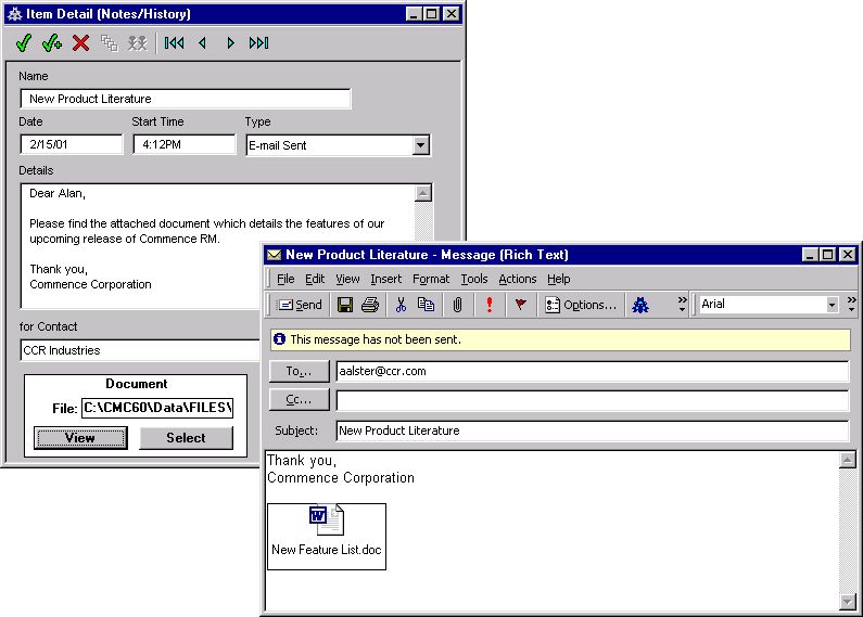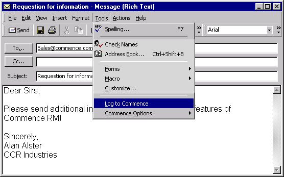 Drag and Drop Items can be dragged and dropped to move them between views. For instance, users can schedule a meeting by simply clicking on a name in an address book and dragging it to the calendar. Detail Form Layouts The arrangement of detail form layouts can be easily created, customized and modified by dragging and dropping fields on the screen. Individual fields' label sizes, fonts, colours, and other attributes can be set and modified. In addition, VB Scripts can be created for detail forms in order to validate field values, automate navigation on the form, and to perform advanced calculations. Word Processing & Faxing Document templates with fields to insert for mail merge operations can be generated from within Commence. External word processors such as Microsoft Word, and Fax software such as Delrina WinFax can be automatically loaded and run from Commence. The name, address and other relevant fields can automatically be inserted into a letter and the letter (or letters for mass mailings) can be printed or faxed, all from a simple request from Commence. Electronic Mail (E-Mail) Electronic Mail (email) enabling allows the user to send and receive email from within Commence. Using its powerful agent technology, Commence can send either a text message or a letter template. Commence can also filter incoming mail and act on the subject matter, the sender, etc. Commence supports MAPI for access to Microsoft mail and VIM for access to CC:Mail and Lotus Notes. E-Mail Integration The enhanced e-mail integration with Microsoft Outlook simplifies the storing and accessing of e-mail in Commence. It allows the end user to log messages directly into Commence with a single click. Examples are provided below: