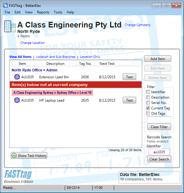 Barcode scanning can be used with tags printed from FASTtag with a label printer, or pre-printed tags with exisiting barcodes can be used. It can also be used to greatly speed up the creation of new items, fields such as Serial Number may be scanned from an item, removing the need to manually enter the number. Optionally, by enabling FASTtag to search all companies when barcode scanning, items that have moved companies or have been entered in the wrong location can quickly be found. Saves time finding exisiting appliancesTry it today!Download Free EvaluationBuy NowFor more information about FASTtag, contact Advanced User Systems on 02 9878 4777 or info@aus.com.au. |