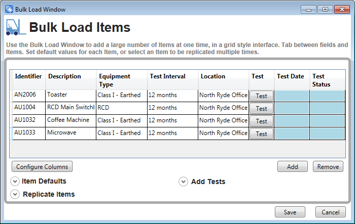 Bulk Load AppliancesRapid entry of appliances in a grid style interfaceWhen you are doing a lot of testing, every few seconds you can save on data entry makes your work more efficient, and makes your life easier. For experienced users, entering Items one at a time in the Item Window, although easy to use, becomes tedious. The FASTtag Professional Edition Bulk Load tool allows you to add multiple appliances at one time, in a spread-sheet like interface. Its very fast to enter the detail in the field, then hit the TAB key to more to the next field. When you reach the last column and hit the TAB key, a new Item is added to the grid, and you can again tab through each field to add the information. Optionally do the testing at the same time - clicking the Test Button (or Enter Key when in the Test column) will record a new Test for the Item. When you are finished entering a group of appliances, click OK and they will be saved to your FASTtag data file, along with any Test results entered. Configurable Columns