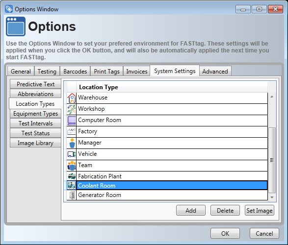 In fact, you can organise the locations in any way you like. FASTtag includes a number of pre-defined Location Types such as Division, Warehouse, Factory and Vehicle. However, with Professional Edition, you can also add your own Location Types, complete with a custom icon which will be displayed in the Location tree.