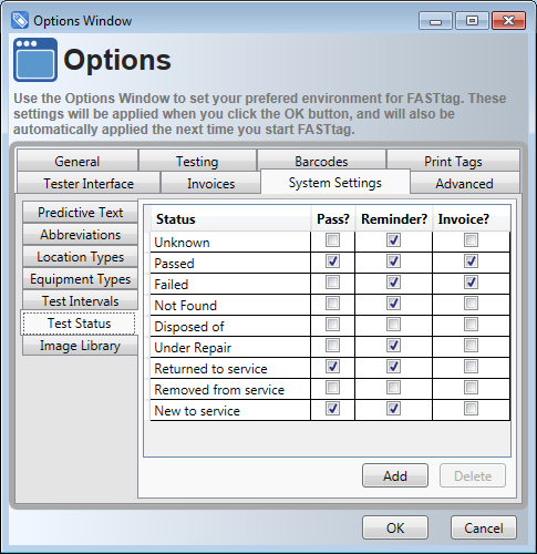 Download Free EvaluationBuy NowConfigurable System SettingsDesign your own Location Types, Test Intervals, Test ResultsCustomise your testing database and reporting with Location Types, Test Intervals and Test Results.
