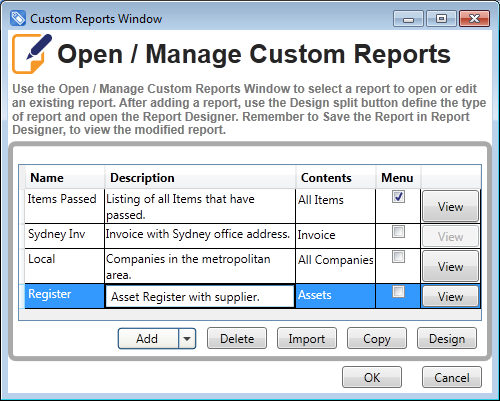 Custom Reports can be easily accessed through the Custom Report Window and displayed by clicking the View button. For reports that will be used regularly, you can also specify that the report should appear on the Reports menu within the FASTtag menu bar. Reports can also be customised to control the records that are included in the report
