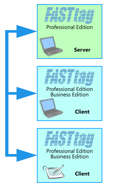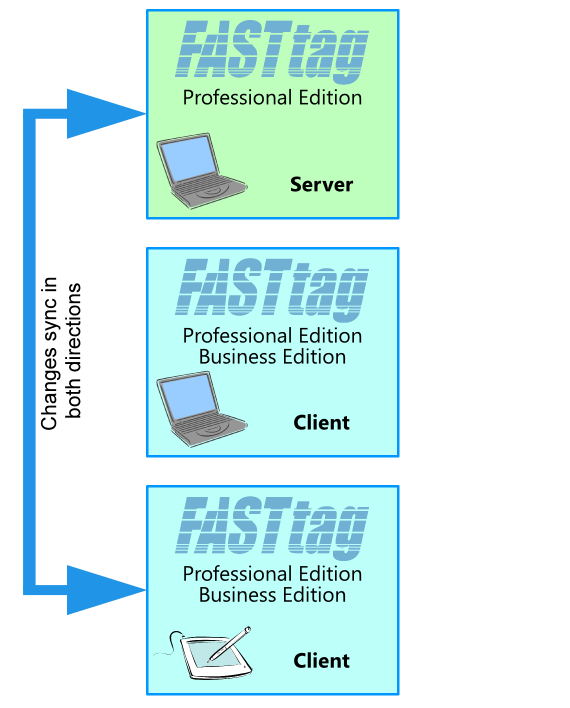 Network Data Sharing - SmartSyncUpdate all users with Data SynchronisationWith Advanced User System's unique SmartSync technology, all FASTtag users share their data across your network. This ensures all Companies and Locations, Appliance Items and Test Results are accurately replicated on all computers and devices. The SmartSync technology tracks all the changes made on each computer, and then when they next synchronise, the changes are replicated. This approach offers many advantages