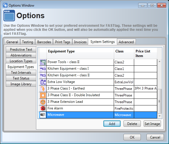 Customisable Equipment TypesCreate your own Item ClassificationsMany professionals are testing beyond the scope of portable appliances and would like to add other types of equipment that are regularly tested, such as Exit Lights and Microwave Ovens. In FASTtag Professional Edition, new Equipment Types can be added, with information such as