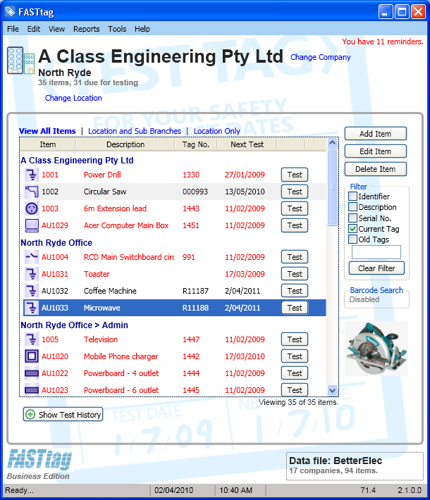 FASTtag Professional Edition has been designed for the Test and Tag Professional with many powerful productivity features such as Invoicing, Customisable Reports, Customisable Tags, Configurable System Settings and Data Export. FASTtag Professional Edition also introduces our unique SmartSync technology, allowing data to be easily shared across the network. The advanced features in FASTtag Professional Edition are unrivalled, and will save you time, while helping you provide a professional service to your customers.