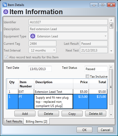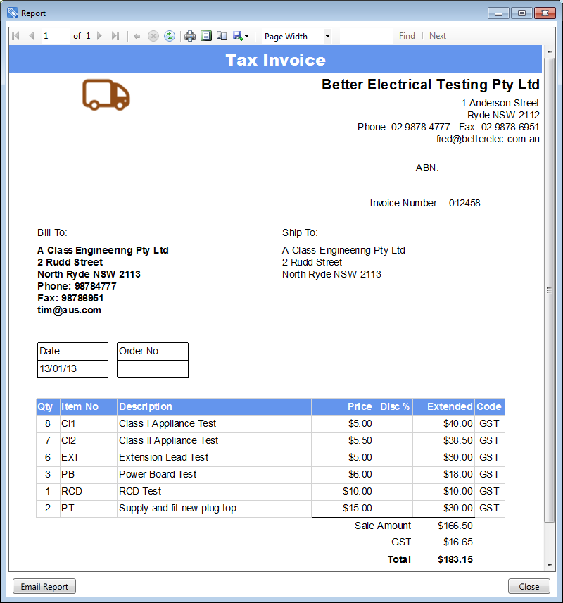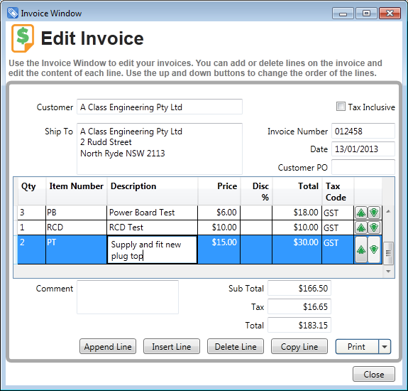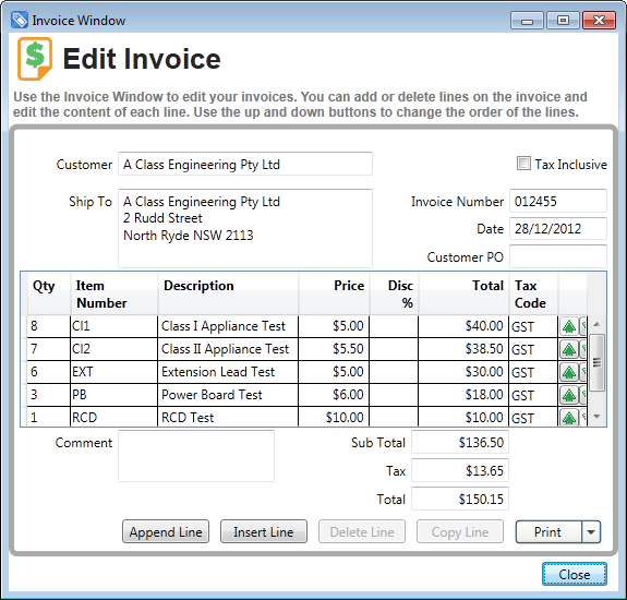 InvoicingAutomatically create Invoices for work perfumedIn any business, we all know how important it is to invoice promptly after performing services. We also know how time consuming and tedious this administrative work can be. This is particularly the case for appliance test and tag, where the number of tests have to be counted, often with hundreds of tests, or even more at large sites. FASTtag Professional Edition provides an easy way to automate this task, maintaining flexibility, and a complete record of the invoice created. Invoices can be automatically generated in a number of ways, and the Price List is used to manage the amounts charged for each test. Invoices can also be manually created on an ad-hoc basis. The Invoice sub-system provides complete flexibility to add line items and modify descriptions or comments, before sending the invoice to your customer, and a record of the Invoice is maintained in the data file.