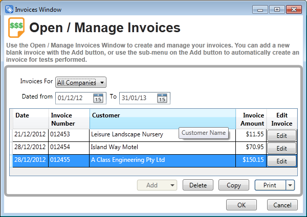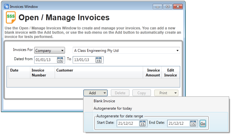 In FASTtag Professional Edition the Invoices are managed from the Invoices Window, where you can view the invoices for all companies, or just the selected company. A date range can be set to filter the list of Invoices. This Window provides a summary listing of invoices, and more detail can be viewed by clicking the Edit button. Invoices can be added using the Add button, either to automatically generate the invoice for tests on a day or range of dates, or on a manual basis. Invoices can also be created by copying an existing invoice as a starting point. The invoice numbering can be set, and is then automatically maintained and incremented by FASTtag. How Automated Invoicing works