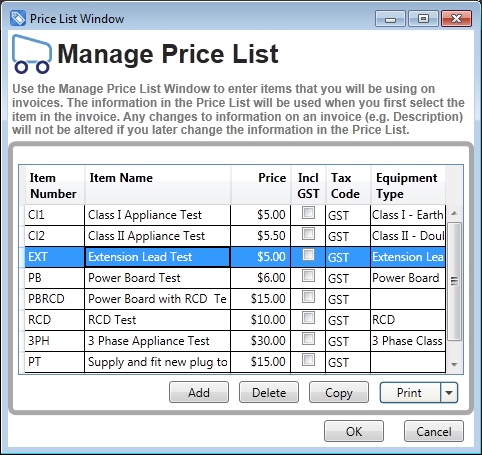Price ListYour listing of Products and ServicesFASTtag Professional Edition allows you to create a Price List, to represent the testing services you offer, and also any products that you provide. The FASTtag Price List is very helpful to conveniently manage your pricing and make the list available to your customers. It is very easy to add new Price List items, or copy an existing item and modify to create a new item. The price list items also record whether or not the price includes tax (GST), as well as common tax codes.
