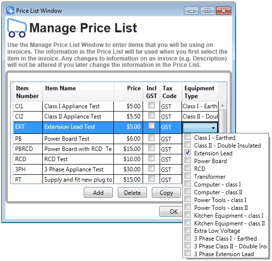 The FASTtag Price List is also integrated with the automatic generation of Invoices. Each Item on the Price List can be linked to an Equipment Type. This allows FASTtag to count up the number of tests performed on each type of equipment (e.g. Class I, Class II, Extension Leads, etc) and then add a line to the invoice for the associated Price List Item, showing the number of times the service was performed.